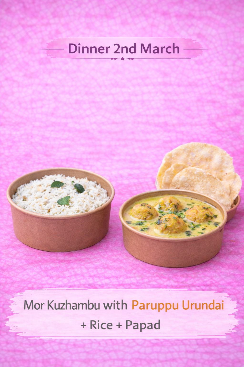 Mor Kuzhambu with Paruppu urundai and Rice and Papad (Classic South Indian yogurt-based curry featuring steamed lentil dumplings)