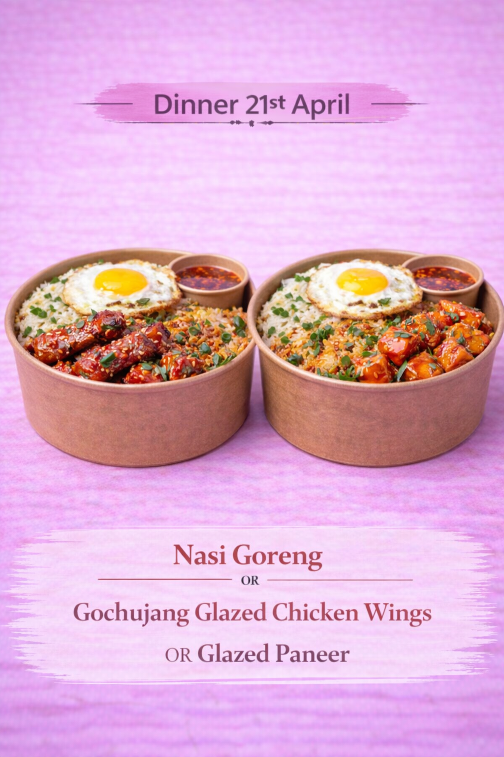 Nasi Goreng with Gochujang Glazed Chicken Wings OR Glazed Paneer