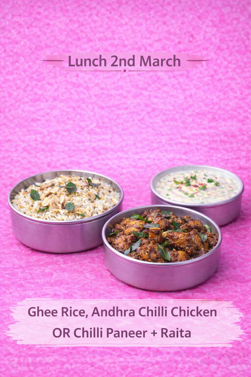 Ghee Rice, Andhra Chilli Chicken OR Andhra Chilli Paneer with Raita