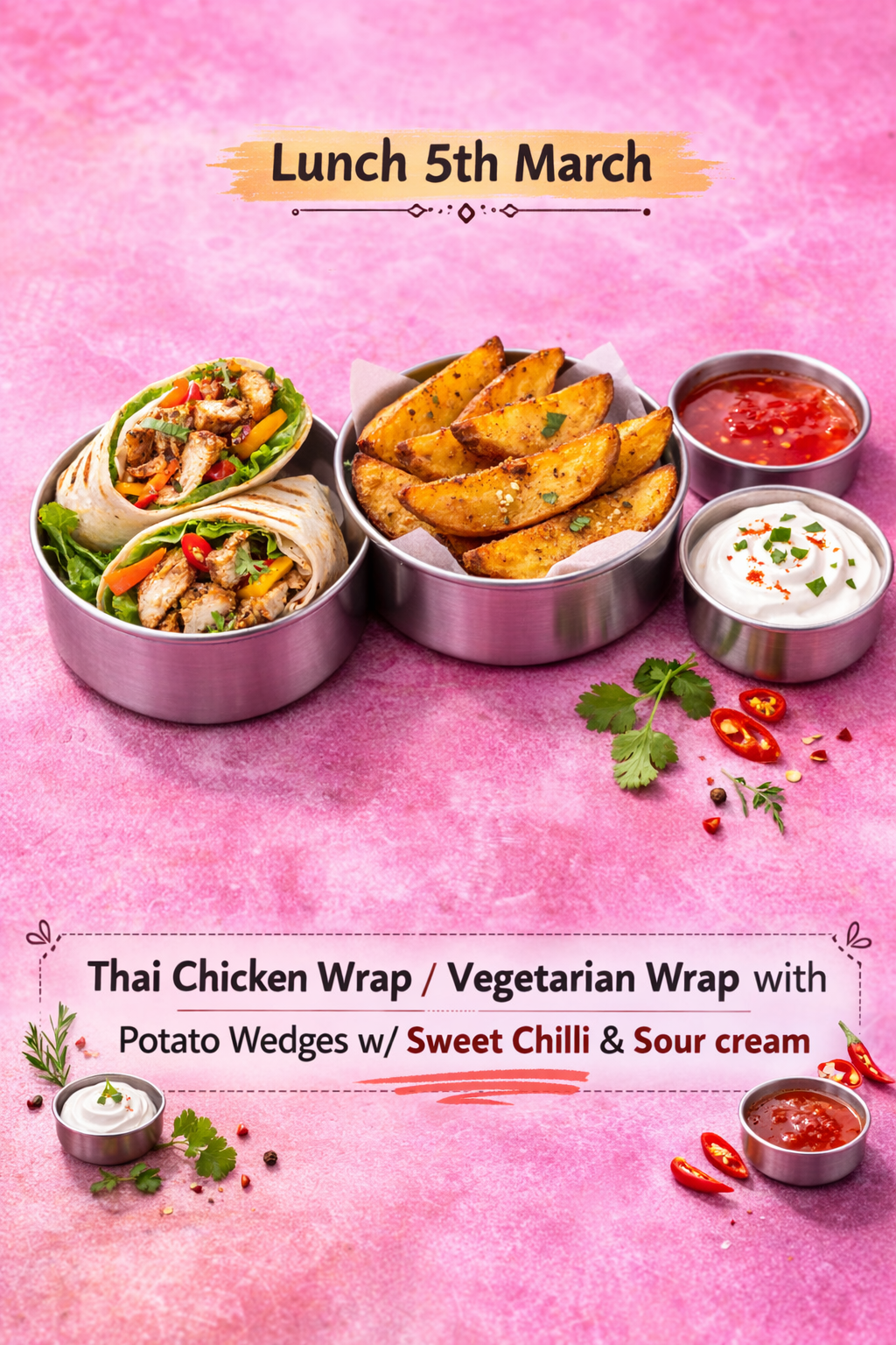 Thai Chicken OR Veg Wrap with Potato Wedges w/ Sweet Chilli & Sour cream